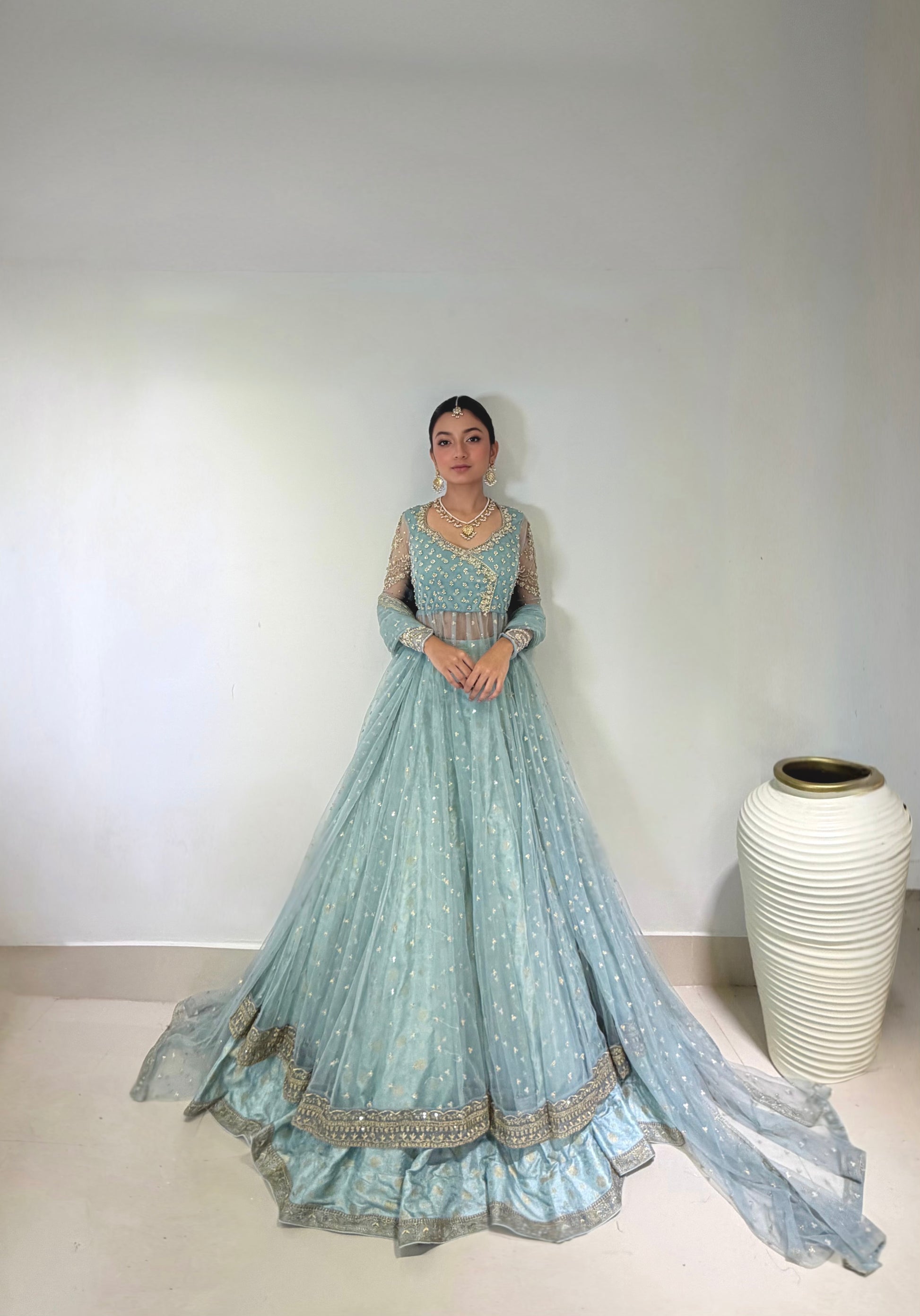 Soft blue hues, delicate handwork, and a silhouette that flows with quiet grace.